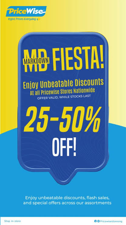 Step into Pricewise, Circle Mall, Lekki and unlock 25–50% OFF during the Markdown Fiesta — where every aisle is packed with unbeatable deals.